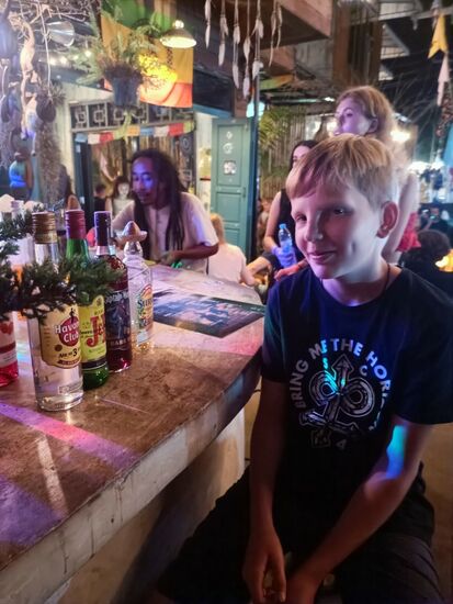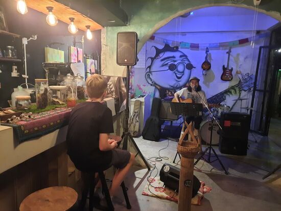 Ansonsten viele Essenstände, viele Bars, viel Livemusik...manch schräge Vögel, manche wohl mit ihrem zweiten oder dritten Leben. Wir sind dann an einer Bar mit LIvemusik hängengeblieben. Der Typ neben Raphael auf dem Bild war auch schon im anderen Universum. Und auch wenn es anders aussieht, Raphael blieb bei Thai-Eistee...er hat sich dann die Musik reingezogen...so von Gitarist zu Gitarrist.