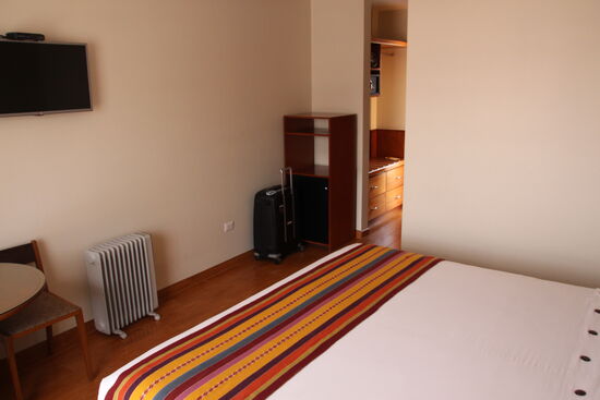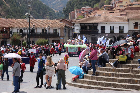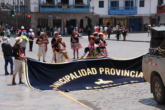 Kurz vor 10:00 tauchte dann Carmello auf, strahlte, begrüßte mich mit Handschlag und meint, er ist gleich wieder da. Also warte ich ein paar Minuten, bis er wie er erklärt mit seinem Bruder und Auto wieder auftaucht. Sein Bruder wird mich fahren. Er betont noch einmal 120 Sol. Ich bestätige und ab geht es. Der Bruder spricht kein Englisch, also ist die Fahrt eher schweigsam und ich lese etwas. Wir fahren genau die gleiche Strecke zurück, die ich hergekommen bin. Nur das heute Samstag ist und deshalb an der Baustelle nicht gearbeitet wird. So Kommen wir gegen Mittag in Cusco an und stehen vor dem Problem, dass die Plaza de Armas abgesperrt ist. Auch kommen wir nicht über die Av. del Sol, weil sich dort ein Umzug formiert. Mein Fahrer hat echte Probleme, in die Gasse zu komme, in die ich muss. Dann klappt es aber doch. Mein neues Hotel ist wieder ein Drei Sterne Haus und sieht auch ganz schick aus. Das Taypikala Hotel liegt mit etwa 60 € pro Nacht icl. Frühstück wieder im Mittelfeld. Es liegt an der Rückfront des Tempel der Sonne. Ungeduldig warte ich, bis ich endlich mein Zimmer bekomme, was ausgerechnet hier und jetzt ungewöhnlich lange dauert. Als es endlich soweit ist, stelle ich nur mein Gepäck ab und ziehe los in der Hoffnung, noch etwas von dem Umzug zu sehen. Der entpuppt sich allerdings als der kürzeste aller Umzüge, die ich je erlebt habe. Er startete am oberen Ende der Av. Del Sol, geht um die Ecke zur Plaza die Armas, halb um den Platz, wobei vor der Kathedrale eine Art Ehrenloge aufgebaut war, und löst sich wieder auf.