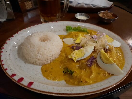 Zum Abendessen war ich heute im Sepia, einem eher etwas schickeren Restaurant bei meinem Hotel um die Ecke nachdem ich vorher einmal um den Block gelaufen bin und mich umgesehen habe, was es so an Gelegenheiten gibt. Ich habe mich für Chili Chicken entschieden. Das ist auch so ein peruanisches Spezialessen Hühnchenwürfel in einer geschmacklich undefinierbaren hellen Creme, die aber irgendwie nicht wirklich ein bestimmtes Aroma hat, Darin drei Stücke Kartoffeln und ein gevierteltes hart gekochtes Ei. Dazu als Beilage Reis. Das Ganze hat äußerlich an ein Curry erinnert, war ok aber im Vergleich zu einem Thai oder indischen Curry enttäuschend.
