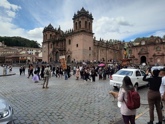 Jetzt hatte ich noch Zeit bis 13:20. Da sollte ich mich hier bei der Agentur einfinde. Da ist doch die Gelegenheit, doch noch die Kathedrale anzuschauen. Sie kostet stolze 40 Sol Eintritt, aus denen dank meine Schwerbehindertenausweis 20 werden. Ärgerlich finde ich, wenn bei den Preisen dann auch noch Fotografieren verboten ist. Immerhin gibt es am Ausgang Postkarten für vier Sol je Stück zu kaufen. Abgesehen davon lohnt sich die Besichtigung schon. Die Kirche ist innen so beeindruckend wie außen. Jetzt ist noch Zeit für eine Latte Macchiato. Obwohl Peru eigentlich sehr gute Kaffee hat bekommt man den hier leider nur selten. Deshalb werde ich Starbucks einen Besuch abstatten. Während ich auf den Kaffee warte, was übrigens länger dauert als irgendwo anders auf der Welt bisher, werde ich angerufen. Die Dame spricht nur spanisch und ich kann mir keinen Reim darauf machen. Sie hat dringend geklungen und ich habe nur etwas in der Richtung verstanden, dass ich um 13:00 in ihrem Büro sein soll. Außerdem habe ich gesehen, dass sie vorher schon drei Mal angerufen hat. Nachdem ich mir beim besten Willen nicht vorstellen konnte, warum und wo, habe ich an die Agentur eine WhatsApp geschrieben, ab ich um 13:00 da sein soll. Kurz darauf kam die Antwort 13:20, wie besprochen also. Da fiel mir nur noch der Laden ein, bei dem ich meine SIM-Karte gekauft habe. Von Claro kommen auch immer wieder Meldungen. Die wussten von nichts. Also bin ich zur Tour Agentur. Es war sowieso 13:15. Als die Dame auftaucht zeige ich ihr die Telefonnummern. Sie kann mit denen nichts anfangen, bietet mir aber an, einmal zurückzurufen. Wie sich herausstellt hat die Dame mit meinem Ausflog zu tun. Mit dem Rückruf hat es sich erledigt. Ich werde von einer weiteren Dame zum Sammelpunkt An der Kathedrale gebracht wo sich nach und nach weitere Teilnehmer einfinden. Währenddessen formiert sich wieder einmal eine kleine Prozession, die einen Heiligenfigur schultert und mit Musikbegleitung langsam loszieht.