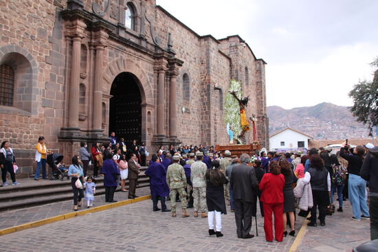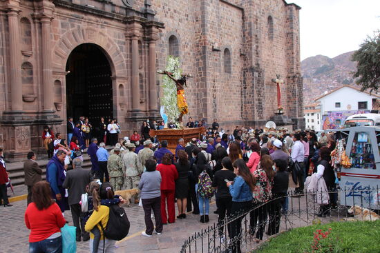 Als die Gruppe beisammen ist geht es nicht wie erwartet mit dem Bus los, sondern zu Fuß. Wir laufen zum Santo Domingo Kloster mit dem Sonnenheiligtum Qorikancha. Nachdem ich da ja schon drin war, spare ich mir das und warte draußen etwa 40 Minuten. Erst setze ich mich auf eine Bank gegenüber und lese etwas. Dann taucht erfreulicherweise die Prozession auf. Ihr Ziel ist ausgerechnet diese Kirche und sie brauchen eine ganze Weile, bis sie darin verschwinden und die Tore hinter sich schließen.