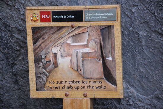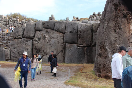 Zeitlich passt das gerade, dass die Gruppe wieder auftaucht und unsere Reiseleiterin nach mir ruft. Jetzt geht es dann auch tatsächlich mit dem Minibus weiter zum Saqsaywaman oberhalb von Cusco. Diese große Festung wurde unter dem 14. und für die Peruaner wichtigsten Inka Pachakuteq gebaut. Wieder eine beeindruckende Anlage. Gerade als wir ankommen fängt es an zu schütten. Hätte ich vorhin etwas gedacht, wäre ich in der Zeit, in der ich warten musste, kurz ins Hotel gelaufen und hätte Jacke und Schirm eingepackt. Habe ich aber nicht. Also habe ich jetzt aus dem Auto heraus für fünf Sol ein Regencape gekauft das mir natürlich viel zu klein ist. Zum Glück hat es nur ein paar Minuten geregnet. Beim Ausziehen ist es dann auch gleich Kaput gegangen.
