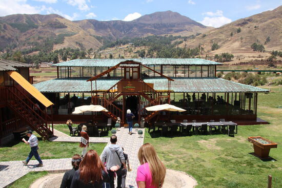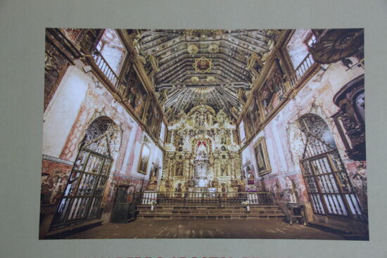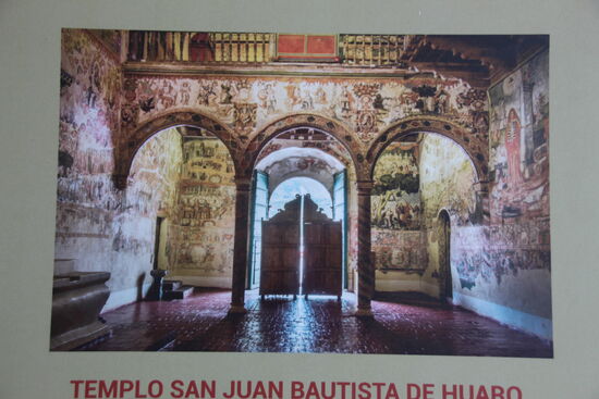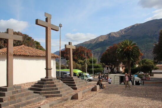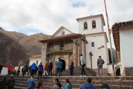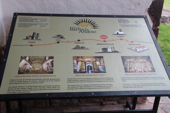 Die erste war gleich nach etwa einer Stunde in dem kleinen Ort Andahuaylilla mit einer prächtigen Kirche die hier als so etwas wie die sixtinische Kapelle von Amerika angepriesen wird. Sie ist allerdings auch beeindruckend und man würde sie nicht an solch einem Ort erwarten. Leider durfte man nicht fotografieren. Dafür stand draußen ein Riesenfoto von der Kirche innen das ich dann fotografiert habe.