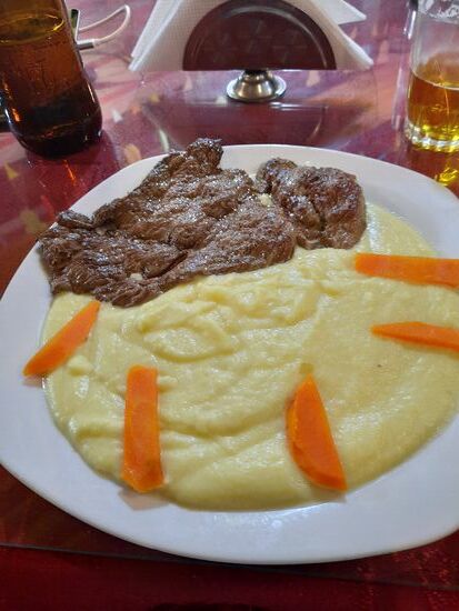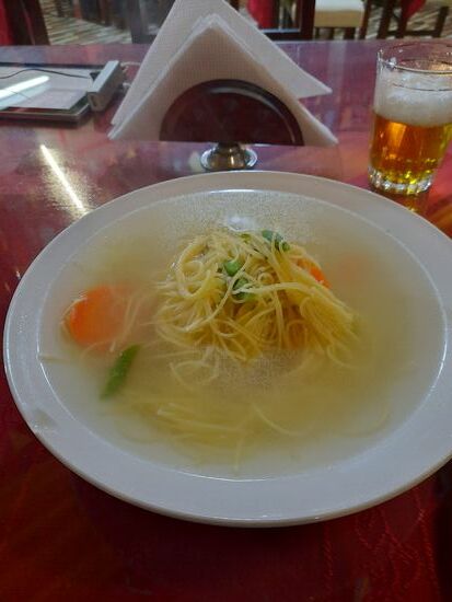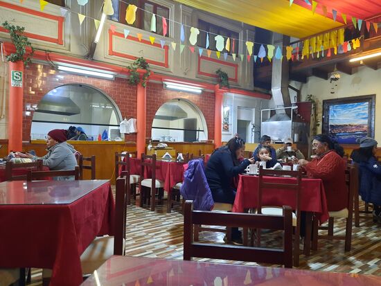 Jetzt bleibt noch die Frage, was zu Abend essen. Mein Handbuch empfiehlt, nicht auf der Fußgängerzone, was ich nachvollziehen kann. Also laufe ich weiter bis zum Plaza des Armas und biege dort rechts ab. Ich komme an einer Polleria vorbei, die recht gut aussieht. Das muss ich mir merken, aber jetzt nicht. Dann biege ich wieder rechts ab und stehe offensichtlich vor der Markthalle. Die ist jetzt zwar geschlossen, sieht aber ganz interessant aus. Während ich weitet die Straße entlangschlendere komme ich an einer Kneipe vorbei, die für mich sehr wenig touristisch wirkt - man bekommt da ja irgendwann einmal ein Gespür - dafür und gehe rein. Wie erwartet bin ich der einzige Ausländer, aber es gibt immerhin eine Speisekarte auf Englisch. Die Suppen kosten hier nur 7 Sol, da werden sie wohl vielleicht nicht ganz so groß sein. Erst bestelle ich eine Hühnercremsuppe. Kurz darauf kommt der Kellner. Die ist aus. Also bestelle ich eine Pollo diet Suppe. Die gibt es hier überall und entspricht unserer klassischen Hühner-Nudel Suppe. Anschließend Alpaka Steak mit Kartoffelpüree. Der Teller mit der Suppe (immerhin keine Schüssel wie bisher immer) war reichlich groß und wäre beinahe übergelaufen. Aber die Sippe war lecker, so wie ich sie mag mit klassischen Suppennudeln und kleine. Hähnchenstückchen. Ich bin noch nicht fertig, da kommt das Hauptessen. Das Steak ist dünn geschnitten und schmeckt gut. Das Kartoffelpüree schmeckt etwas wässrig fade. Irgendwann habe ich mich dann überfressen und es geht kein Bissen mehr. Mit einem großen Bier zusammen zahle ich 40 Sol + Trinkgeld.
