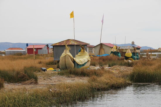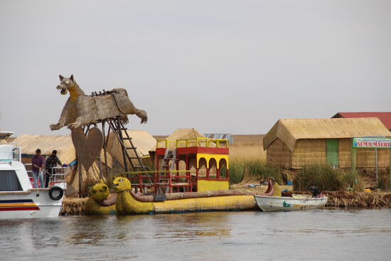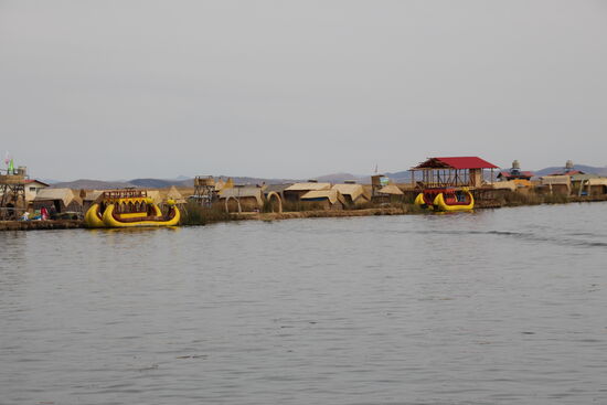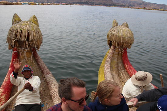 Am Hafen empfängt mich eine junge Dame, Damit, dass ich kurz warten soll. Wenig später lässt sie sich die 100 Sol von mir geben und meint, ich solle in das dritte Boot in der Reihe steigen. Das bringt mich zur Uros Inselgruppe. Dort hole ich meine Grippe ein und kann mich ihr anschließen. Der Bootsführer meint, ich könne auch rauf aufs Dach. Da habe ich die bessere Sicht. So fahre ich die erste halbe Stunde quasi im Privatboot.