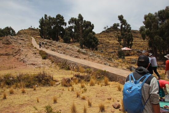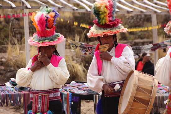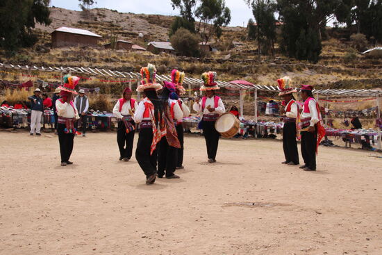 Auf der Insel wird es dann auf einmal richtig warm. Dazu müssen wir noch das erste Stück ganz schön Bergauf laufen. Das besondere an der Insel ist, dass hier die Männer das Textilhandwerk ausüben. Sonst sind das immer die Frauen. Auf dem zentralen Platz, wo wieder einmal Nippes für Touristen angeboten wird bekommen wir Anschauungsunterricht zu Trachten und Bräuchen der Bevölkerung hier.