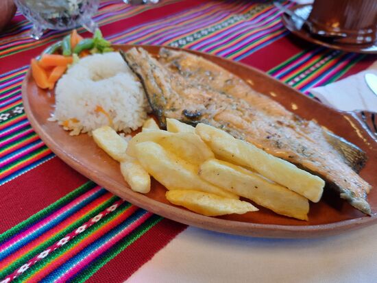 Danach geht es zum Mittagessen. Es ist schon 13:30. Zur Auswahl steht gegrillte Forelle oder Omelette. Davor gibt es Quinoa Suppe und Quinoa Brot. Es schmeckt alles gut. Das Problem ist, dass bei allen anderen das Mittagessen im Preis enthalten ist. Bei mir nicht. Ich muss noch einmal 25 Sol zahlen. Jetzt wird es eng. Ich hätte doch heute Morgen noch wechseln sollen. Unser Guide meint „kein Problem“ und legt mir einen 100 Sol Schein hin. Ich soll ihn ihm am Ende zurückgeben. Ich mache dann noch einmal Kassensturz und stelle fest, dass ich gerade noch die 25 Sol habe. So kann ich ihm seinen 100er gleich zurückgeben.