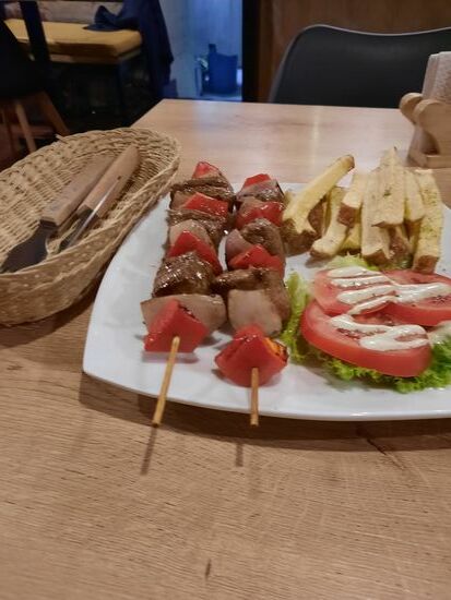 Nachdem es nicht zu weit weg ist, mache ich erst einen Spaziergang dort hin. Das Haus macht einen netten Eindruck. Eher kleiner und recht neu. Dann bummle ich weiter und stelle fest, dass jede Menge Kneipen und Lokale auftauchen. Was das angeht, scheint der Wechsel schon einmal ein Glücksgriff gewesen zu sein. Ich habe Hunger, erwische aber eher eine Bar als ein Lokal. Trotzdem hat das Essen nicht enttäuscht. Zwar scheinen sie besonders bekannt für ihre Hamburger zu sein, wenn man den Zeitungsausschnitten an der Wand glauben darf, aber ich habe eine. Spieß mit Rindfleisch und Paprika, dazu Pommes bestellt und das war auch ganz lecker.