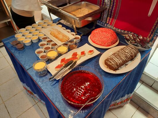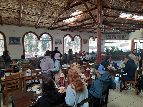 Jetzt geht es endlich zum Mittagessen. Es gibt wieder Buffet und nach dem, was unser Guide erzählt, was es alles gibt, freuen wir uns schon. Allerdings haben wir auch keine Ahnung, was es kostet. Am Ende werden es 35 Sol für das Essen. Das ist zwar nicht so arg viel, aber leider taugt das Essen auch nichts. Die Suppe ist ok, das Alpaka mehr Knochen als Fleisch und völlig eingetrocknet. Das meiste eher kalt. Nur das Nachtisch Buffet war erfreulicherweise wieder ganz gut.