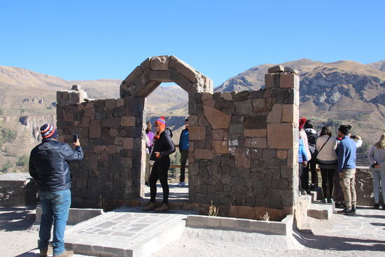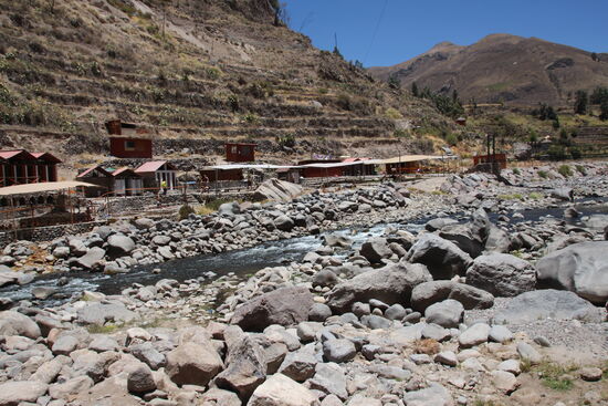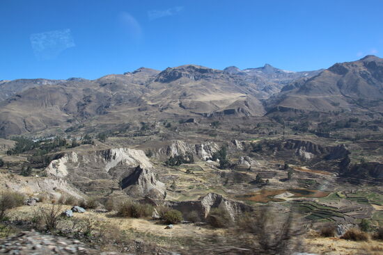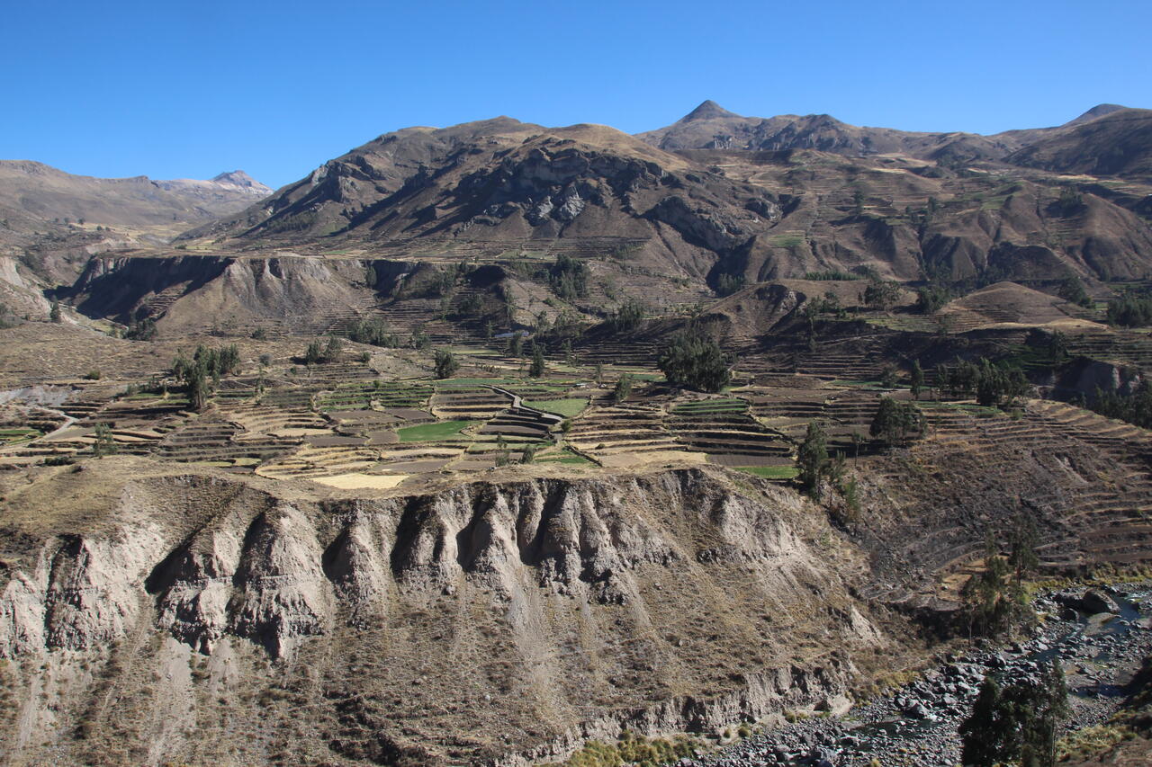 Dann geht es an den ersten Aussichtspunkt. Von hier sind alte Terrassenanlagen zu sehe aus der Inkazeit. Weiter geht es zum nächsten Aussichtspunkt. Unser Guide erklärt uns, dass er noch etwas Zeit verbummeln will, weil wir für die Kondore noch etwas zu früh dran sind. Sie brauchen eine ganz bestimmte Thermik, um im Canyon gleiten zu können. Schonend bereitet er uns darauf vor, dass wir möglicherweise auch gar keinen zu sehen bekommen, weil wir uns in einer Übergangszeit befinden, in der sie sich wegen der schlechten Thermik in andere Gebiete zurückziehen. Hoffentlich nicht.