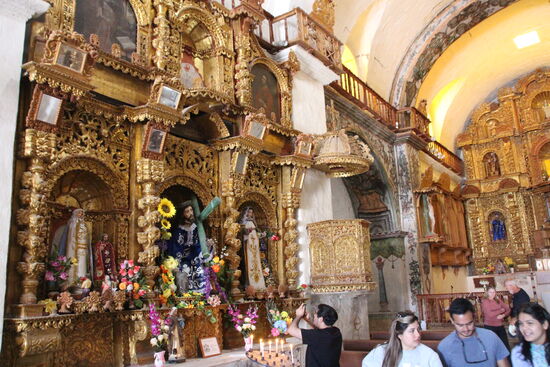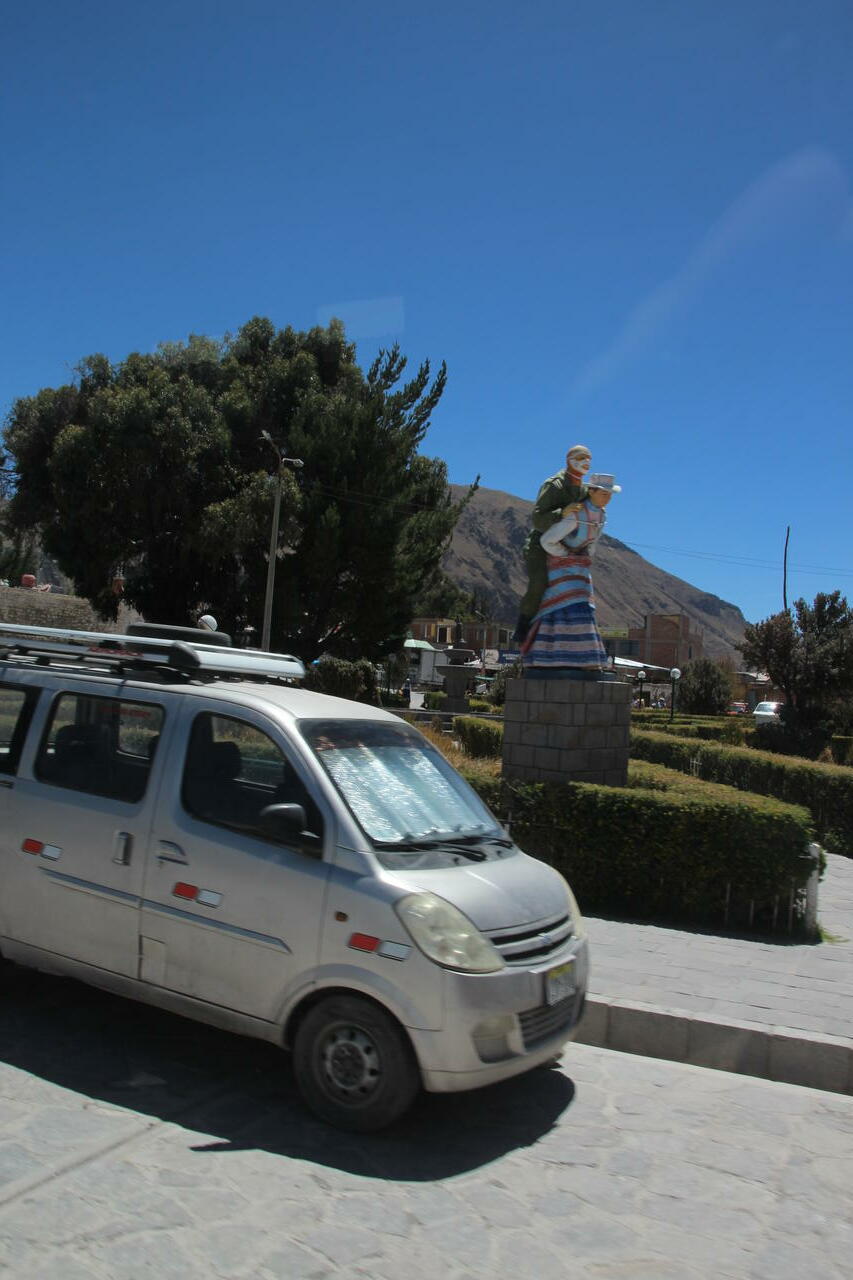 Damit ist die Hauptattraktion des Tages vorbei, das Programm aber noch nicht zu ende. Wir machen uns auf den Rückweg und halten kurz später in einem kleinen Dorf am zentralen Platz. Hier bereitet eine alte, fröhliche Peruanerin Colca Pisco zu. Eine spezielle Abwandlung des Pisco Sour, die es nur hier gibt. Es wird kein Limettensaft, sondern der Saft einer Kaktusfeige verwendet. Unser Guide hat auf der Herfahrt schon davon geschwärmt und ich glaube, wir halten hier auch, damit er sich einen gönnen kann. Er schmeckt auch echt lecker, steigt aber mir zumindest um diese Zeit gleich ordentlich in den Kopf. Außerdem gibt es eine kleine Kirche, der man Erdbebenschäden ansieht, die aber innen wieder überraschend prunkvoll ausgestattet ist. Dann gibt es auch wider die üblichen Ladies mit ihren Alpakas als Fotomotiv zu dem ich mich dieses Mal auch hinreisen lasse.