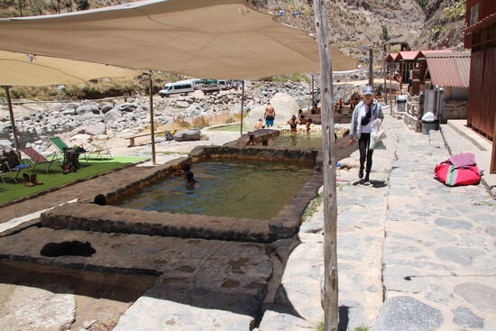 Und jetzt geht es baden. Auf dem Programm steht der kurze Besuch eines Thermalbades mit heißem vulkanischen Wasser. Ich habe mir ein Handtuch im Hotel eingesteckt, aber das ist nur ein kleines, weil ein größeres nicht in den Rucksack gepasst hätte. Beim Blick auf die Anlage kommt mir aber die Idee, ob man vielleicht auch ein Handtuch leihen kann und so ist es. Für 5 Sol leihe ich mir eines und habe dann ein trockenes, in das ich die Badehose einwickeln kann. Es gibt diverse Becken. Wobei ich nur die ersten zwei Teste. Aus der werde kommt das Wasser mit 72 Grad und wird dann in die Becken verteilt. Meine Becken haben 36-36 und 36-38 Grad. Beim zweiten kribbelt es schon ganz ordentlich und als ich nach einer Weile raus gehe, habe ich erst kurz Probleme mit dem Kreislauf.