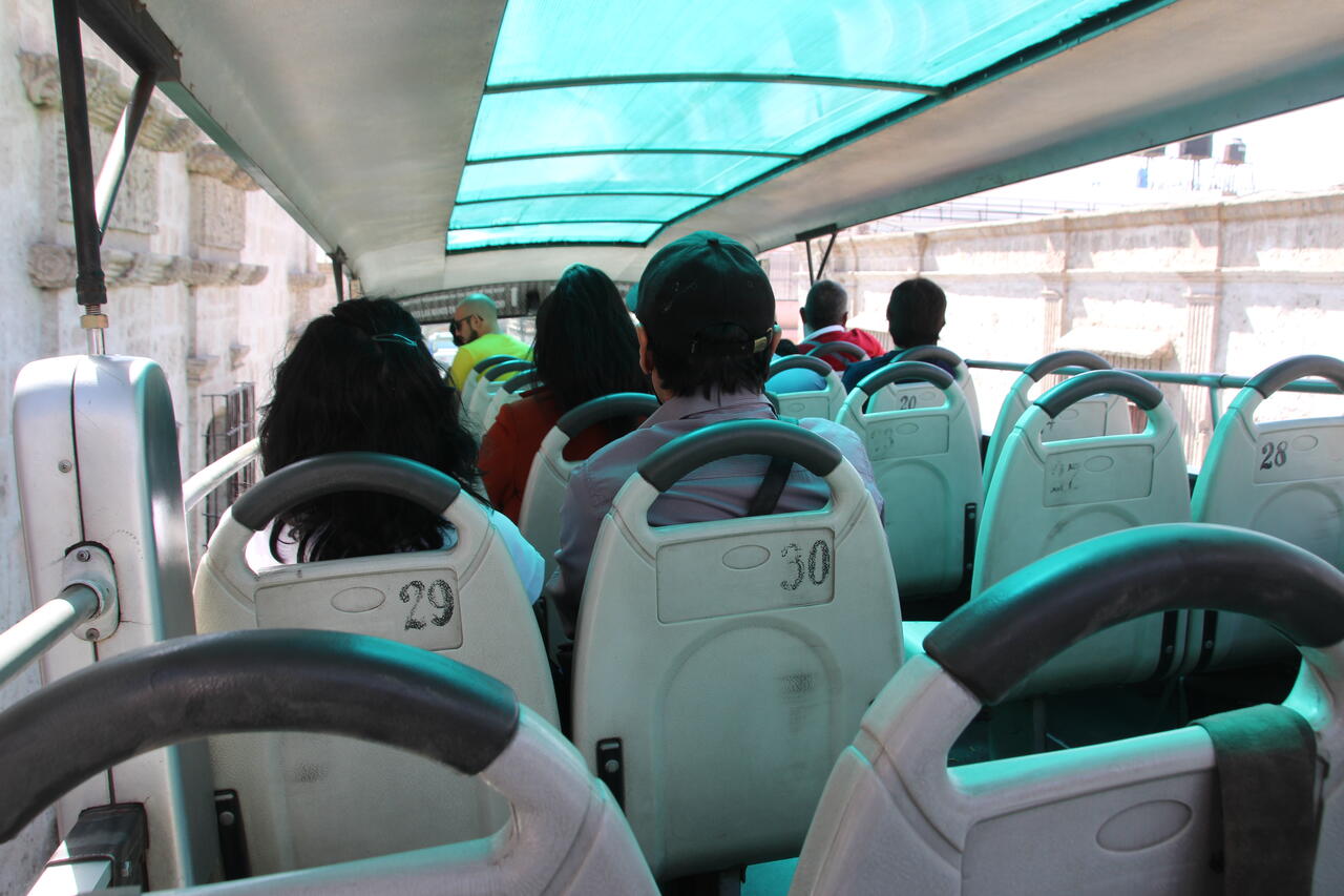 Nachdem ich jeden Morgen zwei Doppeldeckerbusse für Stadtbesichtigungen vor dem Hotel stehen sehe ist es naheliegend, dass ich an der Rezeption nach Tickets frage. Ja klar, die kann ich hier kaufen. Es gibt eine Tour am Morgen und eine um 14:00. Sie kosten 50 Sol. Frühstück lasse ich heute ausfallen und gehe später lieber in eines der gemütlichen Cafés/Kneipen, das La Despensa. Ich bestelle falsch und bekomme statt einem Cappuccino eine. Espresso mit etwas Milch. Er ist trotzdem sehr gut. Dazu nehme ich ein Plundergebäck mit Erdbeermarmelade als Füllung. Eine leckere Alternative zum Frühstückseinerlei. Kurz vor 14:00 warte ich darauf, dass die Busse Vorfahre, als einer der üblichen Minibusse vorfährt und die Dame an der Rezeption mir winkt. Ich meine, nein ich will doch mit dem Doppeldecker oben fahren. Ja, der bringt mich nur zur Abfahrtstelle. Na dann. Wir fahren wieder einmal im Kreis herum bis wir zum eigentlichen Bus kommen. Zu Fuß wäre ich wahrscheinlich in der halben Zeit dort gewesen, aber was solls.