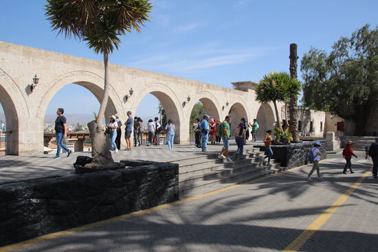 Mein Platz wäre irgendwo in der Mitte, aber ich erkläre, dass ich gerne den Platz in der letzte. Reihe neben der Wendeltreppe hätte. Der bat nämlich einen deutlichen größeren Abstand zum Vordersitz. Nach kurzer Beratung geht das in Ordnung. Eine junge Peruanerin stellt sich als unseren Guide vor. Nachdem ich der einzige nicht spanischsprachige Teilnehmer bin, erklärt sie immer alles erst auf Spanisch und dann für mich noch einmal auf Englisch. Die Tour geht gute vier Stunden und führt im Bogen um Arequipa herum durch die Vorstädte. Sie ist daher eine hervorragende Ergänzung zu der Walking Tour. Erster Stopp ist an einem schönen kleinen Stadtplatz, an dem Arequipa wohl gegründet worden sein soll. Es gibt auch eine hübsche kleine Kirche und eine Terrasse mit einer Bogenkonstruktion und Blick auf die Altstadt.