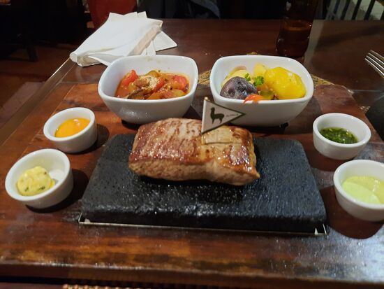 Als Vorspeise wähle ich Forellenstreifen in Sesammantel mit einem Honig-Soja Dipp. Sehr lecker. Dann nehme ich ein Medium gebratenes Alpaka Steak mit Kartoffeln, Ratatouille und diversen Dips. Auch das ist sehr gut. Ein bisschen kitschig finde ich, dass jeder, der Steaks ist, Einen Max und Moritz Latz umgebunden bekommt. Bisher waren die Bedienungen recht höflich und aufmerksam. Ich weiß nicht warum, aber auf einmal werde ich ignoriert. Niemand fragt ob ich noch etwas trinken oder einen Nachtisch möchte. Also rufe ich irgendwann nach der Rechnung, die dann auch auf sich warten lässt. Dementsprechend knausrig werde ich mit meinem Trinkgeld und gehe grußlos. Schade eigentlich.