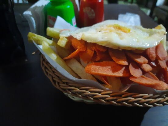 Den restlichen Mittag verbringe ich am Pool. Zu. Abendessen breche ich gegen 19:00 auf und stelle fest, dass die vier Lokale in der Nachbarschaft alle bereits geschlossen sind. Damit bleibt nur noch eine Pizzeria etwas die Straße runter übrig. Dort ist erfreulicherweise auch Betrieb. Dann kommt die Ernüchterung. Es gibt eine einseitige Speisekarte. Pommes mit Hamburger, frittierten Würstchen oder Chicken Wings und kein Bier. Ich nehme Salchipapa, Pommes mit frittierten Wurstscheiben und einem Spiegelei drauf. Damit kann ich zumindest sagen, dass ich auch dieses „Nationalgericht“ getestet habe. Die Pommes waren gut und die Portion üppig wie immer. Muss aber trotzdem nicht zwingend noch einmal sein.