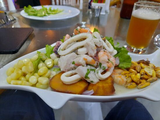 Ihr Mann (?) spielt den Taxifahrer für mich. Die 5 Sol soll ich morgen mit der Zimmerrechnung zahlen. Das Lokal ist hübsch und gemütlich. Ich bestelle erst ein Schichttörtchen aus Kartoffelpüree, gefüllt mit Shrimps, dann ein gemischtes Ceviche. Das Törtchen war ausgesprochen lecker. Das Ceviche war mir wieder zu Zitronen lastig. Wir werden glaube ich keine echten Freunde.