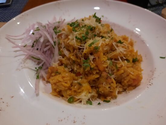 Im Restaurant wähle ich Reis mit Meeresfrüchten. Ich weiß zwar nicht, ob hier im Hotel die Portionen auch so groß sind, bin aber vorsichtig. Siehe da, es ist wieder eine Portion, mit der ich zu kämpfen habe. Es schmeckt gut und der Preisaufschlag für ei. Hotelrestaurant hält sich meiner Meinung nach I. Grenzen. Ich zahle 46 Sol. Nur das Miniaturbier ist mit 15 Sol wieder einmal überteuert.