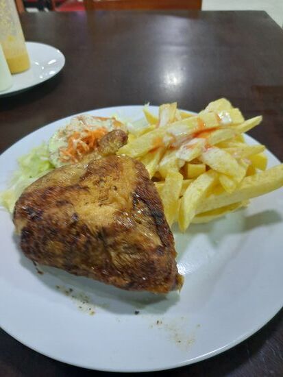 Wie geplant gehe ich zu. Abendessen in das Lokal nebenan. Gestern Abend bin ich noch die Panamericana entlanggelaufen, habe aber kein einziges anderes offenes Lokal finden können. Das Ding hier war zwar ganz gut besucht, wenn auch bei weitem nicht voll, aber ich frage mich, Warum. Von der großen Auswahl bleibt wieder einmal nur eine Karte mit einer Seite – Hähnchen verschiedenen Größen mit Pommes und Salat. Suppe gibt es auch, aber ich vergesse, sie zu bestellen und bekomme sie deshalb auch nicht – obwohl das vermutlich die bessere Wahl gewesen wäre. Im Gegensatz zu meinem lauwarmen Essen dampft die auf dem Nachbartisch. Mein Hähnchen war wie gesagt maximal lauwarm und die Pommes halb roh und lätschig. Kein Vergleich zu dem in Arequipa. Dafür drei Sol teurer.