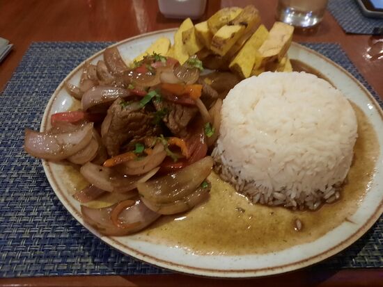 Nach dem tollen Essen gestern beschließe ich, lieber doch wieder im Hotel zu Abend zu essen. Auch heute sind wieder weiter Gäste zum Abendessen hier. So sitze ich zumindest nicht alleine im Restaurant, was mir ja auf meinen Reisen durchaus gelegentlich passiert. Statt dem Mini Bier gönne ich mir heute einen Chilcano, einen Cocktail aus Pisco und Ginger Ale. Zum Essen bestelle ich ein weiteres Nationalgericht, Lomo Saltado. Rindfleisch wird in größere Würfel geschnitten, mehrere Stunden in einer Sojamarinade mariniert und in der Pfanne mit viel Zwiebeln, Paprika, Tomaten und Chili gebraten. Dazu gibt es Reis. Es schmeckt sehr lecker. Das hätte ich mir doch auch früher schon einmal bestellen sollen.