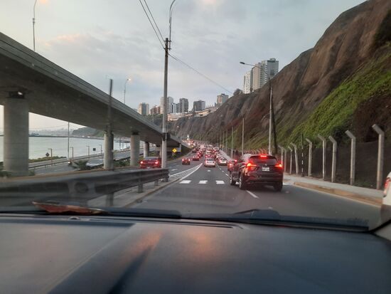 Wieder im Hotel wird es Zeit, zu packen. Ich checke aus und bestelle wieder über Uber mein Taxi zum Flughafen. Anders als früher habe ich mir dieses Mal keine Gedanken machen müssen, ob ich noch genug Bargeld für die Fahrt zum Flughafen habe. Auch das finde ich eine ganz angenehme Eigenschaft von Uber. Mein Fahrer schlägt erst die Richtung Barranco ein, anstatt einmal um den Block und dann direkt auf die Schnellstraße am Meer zu fahren. Ich frage „Flughafen?“ und er nickt. Nachdem ich Zeit habe und der Fahrpreis feststeht ist es mir egal. Kurz darauf biegt er dann an einer großen Auffahrt ab und wir sind auf der erwarteten Strecke unterwegs. Zwei Mal macht er langsam als er merkt, dass ich aus dem Fenster fotografieren will. Überhaupt ist er bisher der sympathischste Fahrer. Kurz darauf stehen wir im Stau. Glücklicherweise löst der sich aber recht bald wieder auf. Am Nördlichen Ende geht es wieder quer durch die Stadt. Es wird dunkel und irgendwann stecken wir dann so richtig im Verkehrschaos fest. Er fragt mich, wann ich am Flughafen sein muss. Man merkt, dass er befürchtet, nicht rechtzeitig anzukommen. Aber ich kann ihn beruhigen. Wir waren ja so früh dran, dass wir immer noch Zeit haben. Wir brauchen dann doch fast zwei Stunden um zum Flughafen zu kommen. Da war es gut, dass die Umstände mich zur früheren Fahrt verleitet haben.