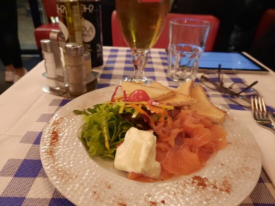 Nachdem ich mein Zimmer bezogen habe, ziehe ich noch einmal los. Normalerweise bin ich nach einem Langstreckenflug keinen Hunger mehr für den Tag. Da das Essen diese Mal recht enttäuschend war, freue ich mich auf ein kleines Abendessen. Es ist bereits nach 20:00. Ich laufe um den Block und lande am Ende im Bistro Aldo. Das ist gut besucht, aber ich bekomme einen Platz im Wintergarten. Ich wähle als Vorspeise geräucherten Lachs mit Salat und Baguette. Als Hauptgang Barberientenbrust mit Orangensoße und Kartoffeln. Auch wenn ich im Nachhinein feststelle, dass das Bistro eher schlechtere Bewertungen bekommt, hat es mir recht gut geschmeckt. Während ich esse, fängt es an zu regnen. Teilweise tropft es durch das Dach, so dass einige Gäste umziehen aber ich habe Glück. Mein Platz bleibt trocken.