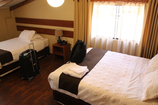 Mein neues Hotel, das Sol Miranda ist sehr gut gelegen, am Durchgang zum zentralen Platz mit den ganzen Kneipen und am oberen Ende der kleinen Straße, die zum Bahnhof führt. Mein Zimmer befindet sich unter dem Dach. Die Gepäckablage so, dass ich kaum hinkomme. Ich beschließe daher, meinen Koffer dieses Mal nicht auszupacken. Ich habe ein zweites Bett, auf dem ich ihn ablege. Der Blick aus meinem Zimmer geht genau auf die Festungsanlage der Inkas, das Bett ist bequem u d es gibt einen kleinen Radiator, mit dem ich notfalls heizen könnte. Damit sind die positiven Seiten aufgezählt. Das Zimmer ist sehr hellhörig, Wi-Fi funktioniert in meinem Zimmer nicht. Im Fernseh sind genau zwei spanische Kanäle erreichbar. Ganz ungeschickt finde ich, dass es mit Badezimmer keinerlei Ablagemöglichkeit für irgendetwas gibt. Inzwischen habe ich auch noch einmal nachgeschaut. Statt einem üblichen drei Sterne Hotel habe ich ein „Boutique Hotel“ erwischt, was ja alles und nichts bedeuten kann. Ganz nett finde ich, dass in dem kleinen Innenhof Tee für die Gäste zur Selbstbedienung bereitsteht. Für umgerechnet etwa 33 € incl. Frühstück ist es aber ganz ok.