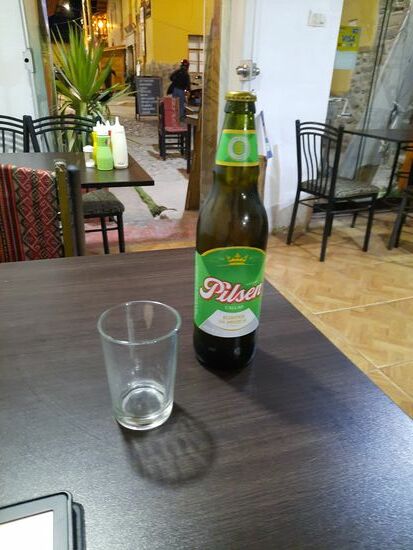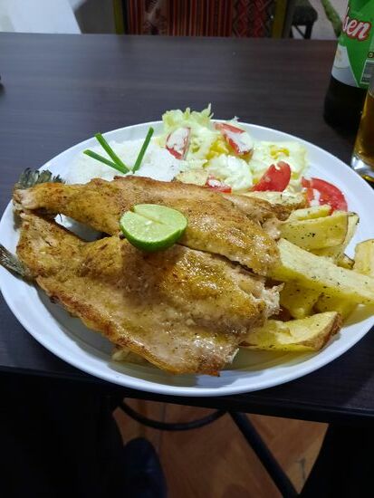 Sonst war heute Faulenzertag angesagt. Zum Abendessen bin ich drei, vier Mal um den Platz herumgelaufen, ohne mich für eines der Lokale entscheiden zu können, die im Gegensatz zu heute Mittag jetzt auch durchgängig recht leer ausgesehen haben. Ich bin dann in ein Lokal gegangen, das sich quasi am Hinterausgang des Platzes befindet und sogar nichts mit den hübsch aufgemachten Lokalen rund um den Platz zu tun hat. Hier waren auch nur Einheimische nach meiner Einschätzung. Und hier habe ich eine hervorragende gegrillte Forelle (besser als die in Bogota), und mit 12 Sol für eine große Flasche das bisher günstigste Bier bekommen. Mit den Kartoffeln und dem Gemüse als Beilage war es beinahe wieder zu viel. Man ist nur nicht so besonders bequem gesessen. Garagenstil mit kleinen Stühlchen.