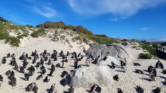 Aber aus diesem Grund waren wir ja nicht hier, sondern vielmehr wegen der Pinguine, die in Australien hier sozusagen beheimatet sind. Der Australische Pinguin zeichnet sich dadurch aus, dass er nahe des Boulder Beach in Simon's Town in einer grossen Kolonie lebt und darauf wartet fotografiert zu werden. Die Fahrt hierher dauerte ca. 10 Minuten. Nach einem kurzen Spaziergang zum Eingang haben wir unseren Eintrittsobolus von ca. CHF 12.00 pro Person (lass es etwas weniger sein) welcher für die Attraktion zwar übertrieben viel ist, uns aber nicht weseltlich ärmer macht, bezahlt.
