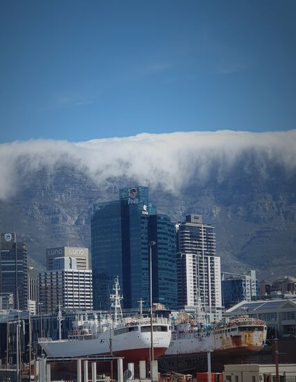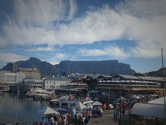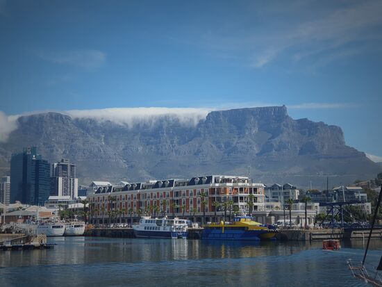 Nach einem schlechten Check-In haben wir dann im "The Portswood Hotel" an der Waterfront unser Zimmer mit Blick auf den Tafelberg bezogen. Dieser zeigte inzwischen zumindest schon die Ecke in der die Seilbahn ankommt. Sozusagen eine Ecke seiner Tafel, aber auch nicht mehr.