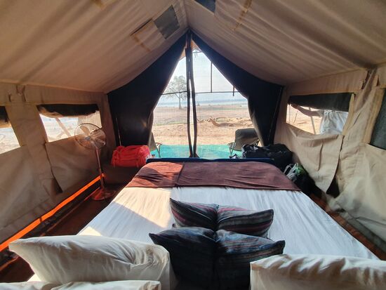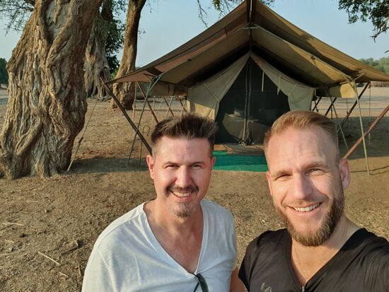 Das vorzügliche Abendessen mit den vier anderen Campern und, dem Guest Relations Manager und einem Guide dauerte inkl. Apero und Degistiv zwei Stunden, bevor wir müde zum Zelt begleitet wurden, damit wir im Hauche des Ventilators nach einer erfrischenden Buschdusche sanft einschlafen durften, da wir um fünf Uhr morgens wieder geweckt werden würden.