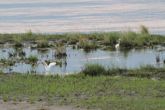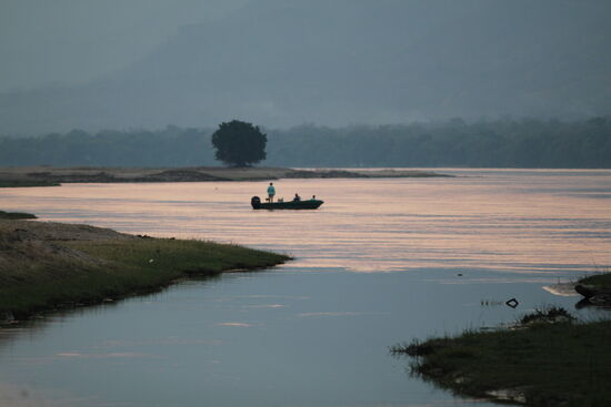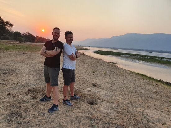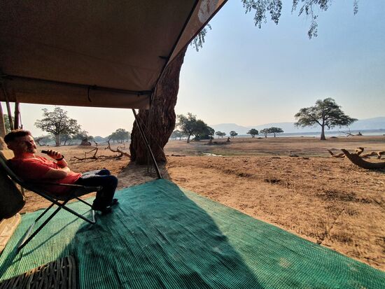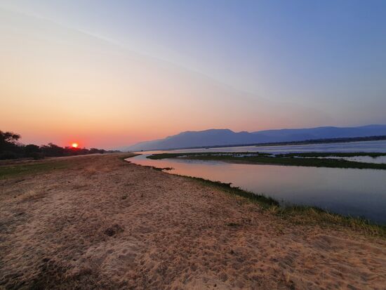 Wie bereits erwähnt, liegt der Mana-Pools Nationalpart am Sambesi River und demzufolge an der Grenze zwischen Sambia und Simbabwe. Wenn wir also vor unserem Zelt sitzen, schauen wir in die Sambischen Berge. Was die Erfahrung der Abgeschiedenheit - die es für Simbabwe ist - etwas schmälert, ist die Tatsache dass es auf der gegenüberliegenden Flusseite Zivilisation in Form von Häusern und Motorboten wahrnehmen kann.