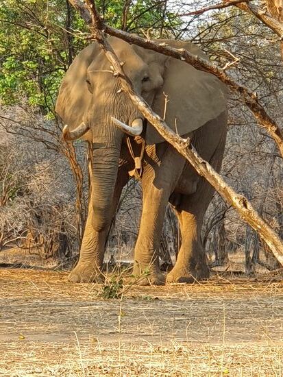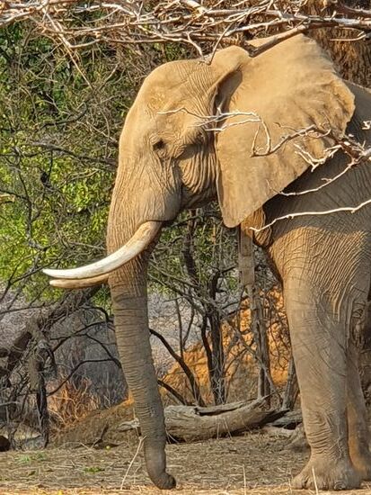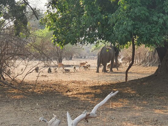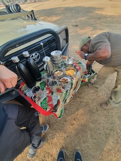 Nach gut 2.5 Stunden haben wir an einem der Pools halt gemacht und bei Kaffee, Tee, getrockneten Mangos und einer kalten Grillwurst eine halbe Stunde Pause eingelegt. Die Nilpferde im Pool haben ausser ab und an zu atmen nicht viel Action geboten, weshalb wir bald weiterfuhren, immer auf der Suche nach einem der stehenden Elefanten - also Elefanten, die sich auf die Hintebeine stellen, um an die exquisiteren Blätter in den Baumkronen zu kommen. Leider haben wir davon keine gesehen, dafür aber das: