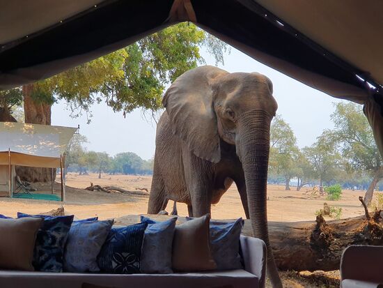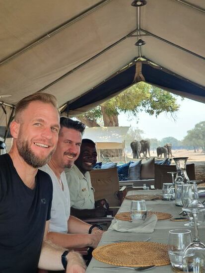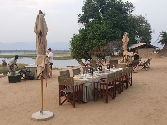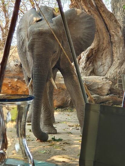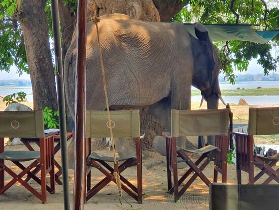 Unterbrochen wurden wir beim Essen nur von einer Herd von ca. 6-8 Elefanten, die um das Essenszelt herumgelungert sind und unten im Fluss eine erfrischende Elefantendusche genossen haben.