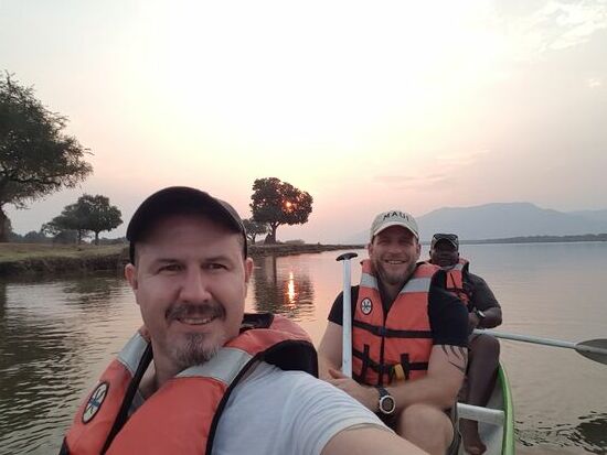 Highlight des Tages war die angesetzte Kanufahrt über den Sambesi. Beim 15.00 h Tee (für uns eher ein kaltes Getränk statt Tee) haben wir kurz die frisch angereisten Briten und Austrlier kennengelernt und sind dann mit zwei Guides und Iris - einer Luxemburgerin mit geiler Lache - ca. 20 Minuten den Fluss hinaufgekarrt worden.