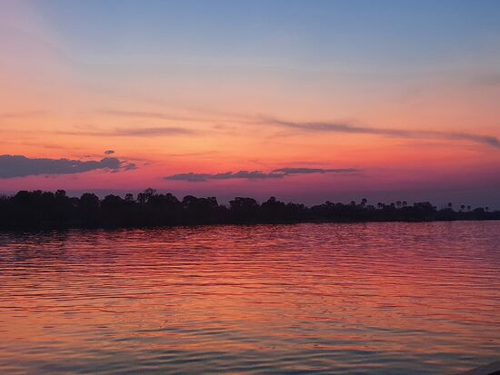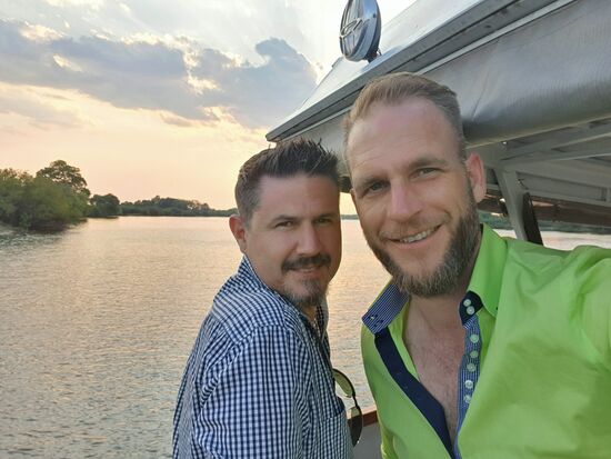 Für USD 75.00 p.P. + USD 10.00 Parkgebühren haben wir 3 Stunden auf dem Sambesi River, ein vier Gänge Menu inkl. aller Getränke (GinT, Weisswein, Rotwein, amerikanisches schwarzes Süssgetränkt ohne Zucker und Whisky mit amerikanischem schwarzen Süssgetränk mit Zucker, aber leider kein Kaffee, den gibt es nicht an Bord) und noch eine Safari auf dem Fluss bekommen. Wer immer in Vic Falls halt macht, muss bei "Pure Africa" unbedingt so eine Dinner Cruise buchen. Besser angelegtes Geld und besser angelegte Zeit gibt es nicht. Man könnte es fast romantisch nennen.