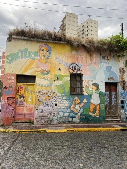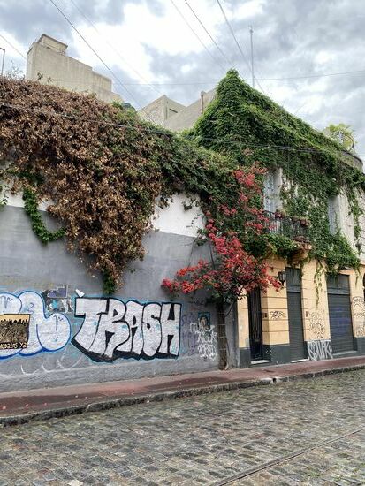 Da wir nur eine Nacht und einen Tag in Buenos Aires sind entscheiden wir uns für San Telmo. Das kleine Künstlerviertel mit süßen kleinen bemalten Häusern die von meist Bougainvillea-Sträuchern bewachsen sind.