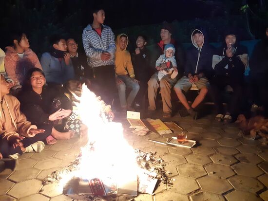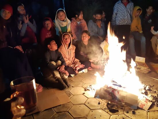 Der Tag klingt an einem kleinen Feuer mit viel Gesang aus. Es ist abends schon empfindlich kalt und eine Heizung gibt es nicht. Da tut die Wärme am Feuer gut. Außerdem herrscht richtig gute Stimmung, denn die Jungen und Mädchen veranstalten ein regelrechtes Battle. Wir sind erstaunt über die vielen Lieder, die sie beherrschen. Für uns war es ein besonderes Erlebnis!