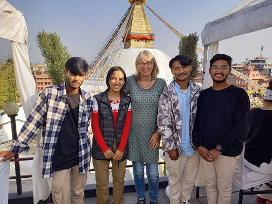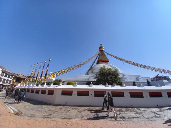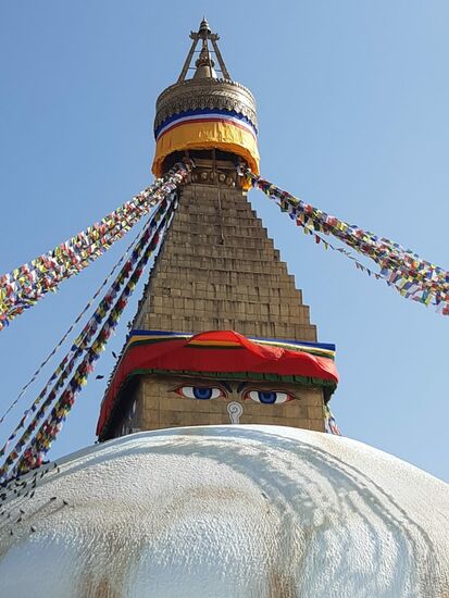 An diesem Platz gibt es eine riesige Stupa. Sie war durch das Erdbeben stark beschädigt und erstrahlt jetzt im neuen Glanz. Wunderschön anzusehen! Die Stupa ist ein bedeutendes Ziel für buddhistische Pilger aus Nepal. Der Eintritt kostet für uns 400R/Person.