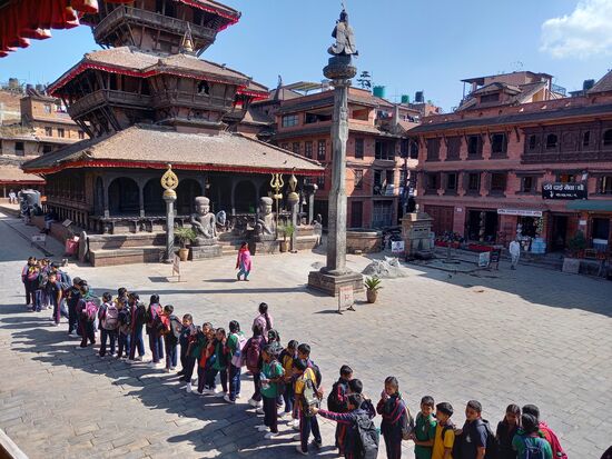 Anjali und wir nehmen den gleichen Bus. Für 60Rupie pro Person (0,46€) fahren wir bis Bhaktapur. Dort müssen wir Abschied nehmen von Anjali. Wir werden natürlich im Kontakt bleiben. Sie fährt weiter nach Kathmandu. Dort besucht sie ein College und wohnt in einem Hostel.