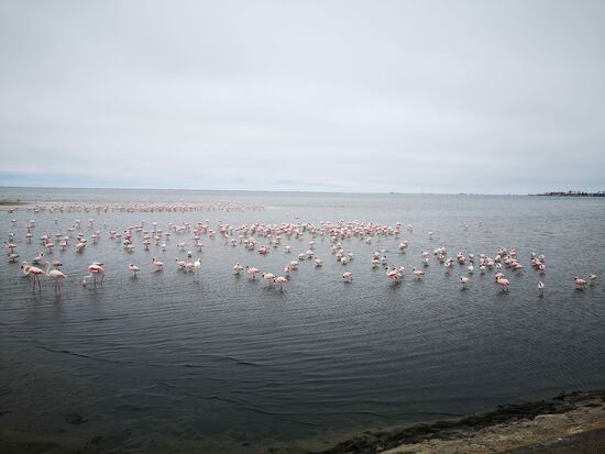 in Walvis Bay treffen wir auf tausende von Flamingos. Sie werden von dem salzigen Wasser in der Lagune der Stadt angezogen.