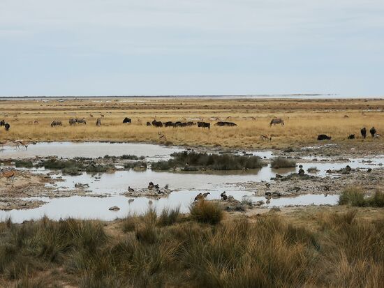 Eins der wenigen nicht ausgetrockneten Wasserlöcher im Park. Vor allem in der Trockenzeit kommen die Tiere regelmäßig zum Trinken an die Wasserstellen.