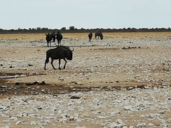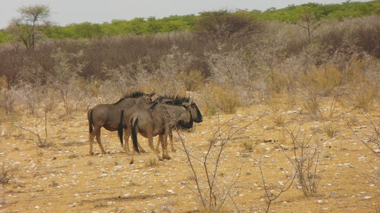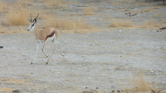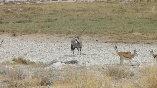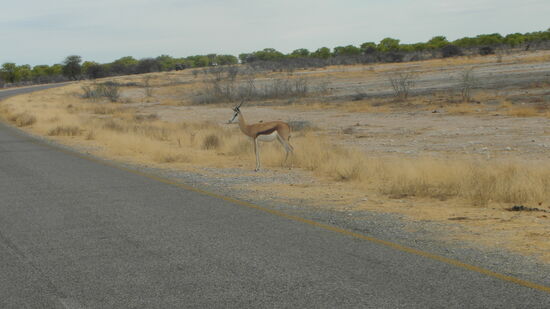 Als wir am nächsten Morgen das Anderson Tor, benannt nach dem schwedischen Forscher Anderson, der 1851 das Gebiet entdeckte, passierten, trafen wir auf die ersten Spring- und Gemsböcke und waren frohen Mutes auch weitere Wildtiere im Park zu sehen. Wir hatten bereits am Vortag unseren Passierschein – auch in Afrika muss alles seine Ordnung haben - ausgefüllt, sodass wir problemslos das Anderson Tor, dann die Polizeistelle durchfahren konnten und im Ort Okaukueje, der letzten Station mit Shops, Toiletten am Park, den Eintritt für uns und unser Auto beglichen.