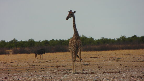 Dann ging es auf den ausgewiesenen Straßen, die ziemlich holprig und ausgefahren sind, bis zur ungefähren Mitte des Parks, der Halali Station, benannt nach dem deutschen Jägerhalalli. Die ursprüngliche Bedeutung nach erfolgreicher Jagd zum Halali blasen, ist natrülich im Park nicht mehr relevant. Im Gegenteil, erst nach nach gut vier Stunden konnten wir das Auto wieder verlassen, ansonsten, so besagt die Etosha-Verhaltensregel, können allein die Fenster zum Sehen und Fotografieren geöffnet. 60 km/ h sollten nicht überschritten werden, bei dem Straßenzustand sind wir oft allerdings oft froh gewesen, mit 20 bis 30km/ h den Wagen unbeschadet durch den Park zu bekommen. Aus diesem Grund wählten wir auch für die Weiterfahrt am Tag darauf eine längere, aber besser zu befahrene Straße. Wir fuhren im Park von Wasserloch zu Wasserloch, folgen auch dem Rhino Drive, und erfreuten uns an vielen schönen Tierbeobachtungen. Leider ließen sich Elefanten, Löwen und Geparden nicht sehen. Dafür konnten wir beim Verlassen des Parks am Straßenrand noch mehrmals Giraffen beobachten.