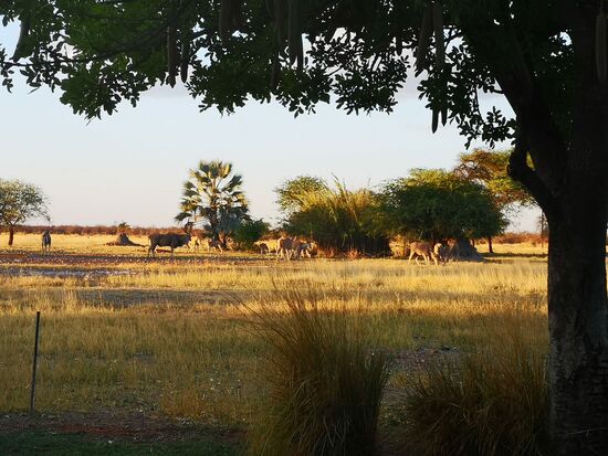 Auf dem Weg zum Okavango River ca 30 Kilometer nach Grootfontein gleich an der Hauptstraße befindet sich eine vergleichsweise kleine Farm, inhabergeführt, und wunderschön mit wenigen kleinen Chalets, einem parkähnlichen Innenhof sowie einem flachem Haupthaus, von dem sich aus ein herrlicher Blick auf die umliegende Farmlandschaft bietet. Elands, Impalas, Springböcke tummeln sich mit Straußenvögel am Wasserloch in der Abendsonne. Wir sitzen bequem mit einem Glas kühlem Weißwein auf dem Sofa an der Hauswand, sehen den Tieren zu. Die Verwalter, ein Ehepaar, setzen sich zu uns, wir kommen ins Gespräch und erfahren von den Schönheiten und Härten des Farmerlebens im heutigen Namibia. Beide stammen aus Auswandererfamilien mit deutschen Wurzeln, die weit in das letzte Jahrhundert reichen. Deutsch sprechen sie nicht mehr. Sie haben Afrikaans gelernt und so verständigen sie sich bis heute. Das vergleichsweise einfache Leben mögen sie, erfreuen sich an Natur und Tierwelt und übernehmen gern für ein paar Monate im Jahr die Verwaltungsarbeiten in Farmen. Die andere Zeit über leben sie an der Küste, dort, wo sich die Rentner aus aller Welt zum Lebensabend treffen. Aber ihre vier Kinder konnten sie nicht für das Farmleben begeistern, sie wollten aus ihrem Leben etwas machen. Das sei in Namibia recht schwierig. Interessante Jobs, mit denen man auch noch gutes Geld verdient, sind rar in Namibia, hören wir immer wieder. Insofern verstehen die Eltern, dass die Kinder in der gesamten Welt verstreut sind.