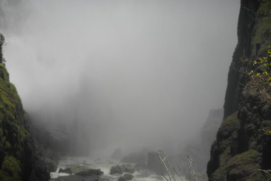 Tosend braust das Wasser hinunter in die Schlucht. Die Gicht führt zu teilweise heftigen Regenschauer entlang des Weges.