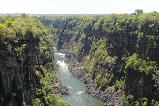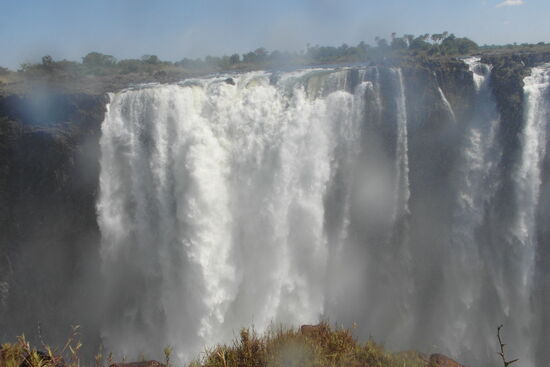Die Wasserfälle bilden die Grenze zwischen dem oberen und unteren Sambesi und können sowohl von Simbabwe aus als auch von der sambischen Seite betrachtet werden. Die Victoria-Wasserfälle gehören zu den sieben Naturweltwundern und wurden nach der englischen Monarchin Victoria im 19. Jahrhundert benannt. Verantwortlich hierfür ist der britische Entdecker Livingstone, der auf mehreren Routen die Wasserfälle und die zahlreichen Schluchten entdeckte. An seinem Denkmal ganz im Westen des Parks beginnen wir unseren zweistündigen Marsch entlang der Fälle. Wir wandern entlang der Schlucht, in die das tosende Wasser von dem ruhig heran fließenden Wasser des Sambesi braust, durch herrlich kühlen Regenwald, durch einige Schauer kühlen Nass,` die durch die Gicht von den Wasserfällen durch den Wind herüber geweht werden bis zur Brücke nach Sambia. Immer wieder bietet sich uns ein phantastisches Bild auf die atemberaubende Naturgewalt.