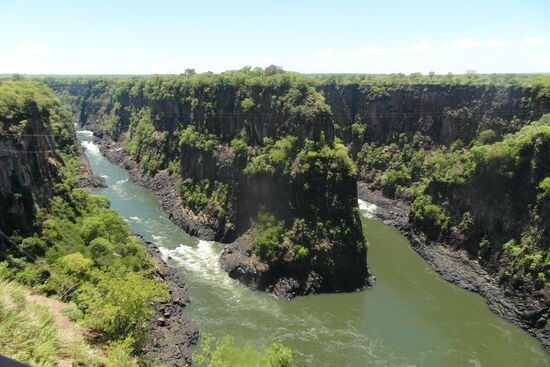 So kommt der Sambesi ruhig angeflossen und tost dann in die Tiefe. Die Inseln im Fluss sollen zur Regenzeit vollständig überschwemmt sein.
