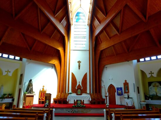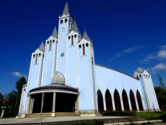 Die alles überragende Heiliggeist Kirche, auch blaue Kirche genannt, mit ihren 7 Türmen. Gebaut nach Plänen von János Bokskai, für ca. 1000 Leute. Bauzeit 3 Jahre, Einweihung 9. 9. 1999.