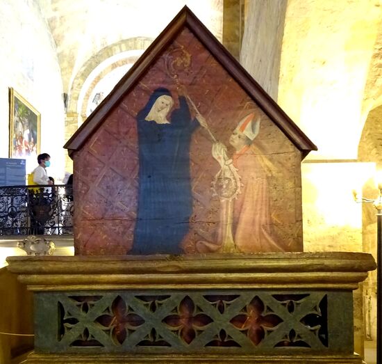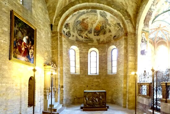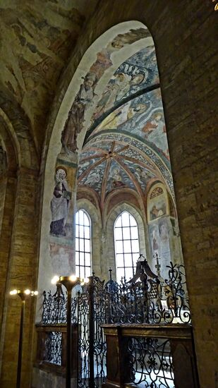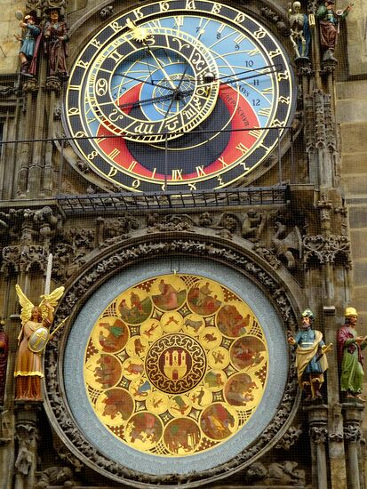 Astronomische Uhr, das mechanische Uhrwerk mit dem Zifferblatt stammt aus dem Jahre 1410 und ist das älteste Teil der Uhr. Im 2. Wk wurde sie schwer beschädigt, aber in 1948 wieder instand gesetzt.